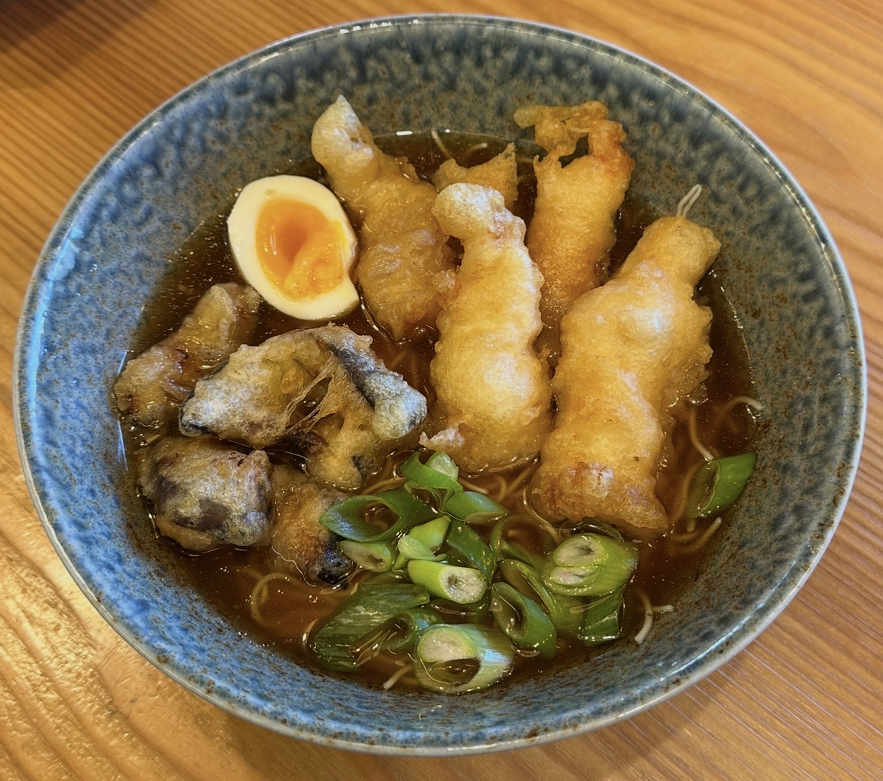 Ramen con gamberoni in tempura, cipollotto, melanzane in tempura e uovo sodo.